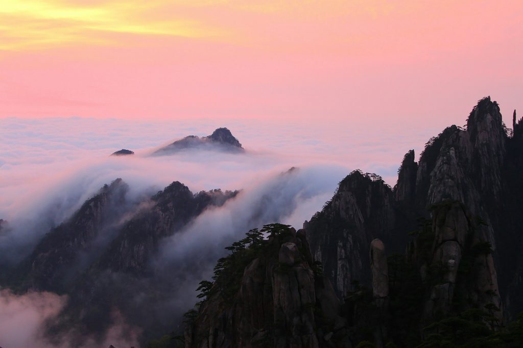 Национальный парк горы Хуаншань, известной также как Жёлтая гора, расположен в провинции Аньхой в Восточном Китае. Причудливые сосны, необычные по форме гранитные пики и море облаков в этой местности с древних времён привлекали сюда поэтов и художников, которые вдохновлялись пейзажами. Всего в природном парке 88 горных вершин высотой от 1 000 метров, а три пика — Лотосовая гора, Сияющая вершина и Небесная столица — возвышаются более чем на 1 800 метров. Как раз на них и расположены смотровые площадки Хуаншаня.