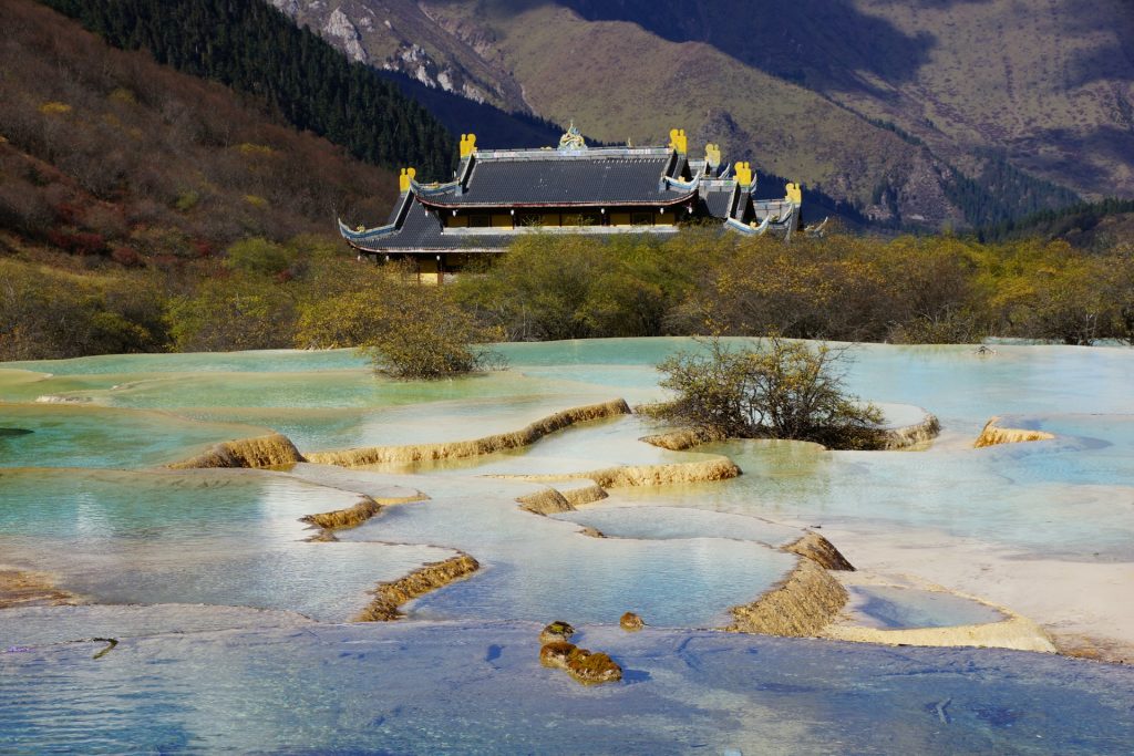 Природный заповедник в провинции Сычуань, известный травертиновыми террасами из известкового туфа различных цветов и форм. Хуанлун включён в список Всемирного наследия ЮНЕСКО как уникальная пейзажная достопримечательная зона, а название парка означает «жёлтый дракон», хотя цветов здесь на самом деле намного больше. Всего на территории заповедника расположено более 3 400 природных бассейнов, которые заполнены водой серебристого, розового, изумрудного, голубого, жёлтого и других оттенков. Цвет зависит от содержания водорослей и бактерий.