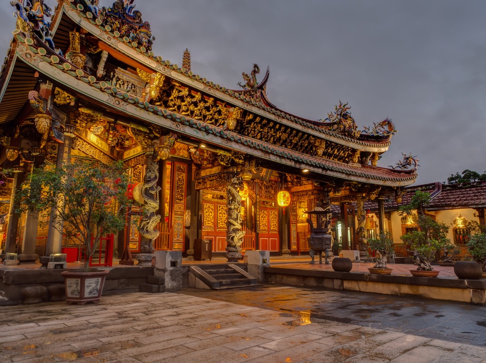 Южнее расположен портовый Гаосюн, где культовые сооружения поражают масштабом и изяществом. Священный зал военных и литературных искусств объединяет почитание бога-воина Гуань Гуна и Конфуция. Первый этаж украшен алтарями и деревянной резьбой, второй посвящён философу, а третий воссоздаёт покои Нефритового Императора, сверкающие росписями и драконьими узорами.