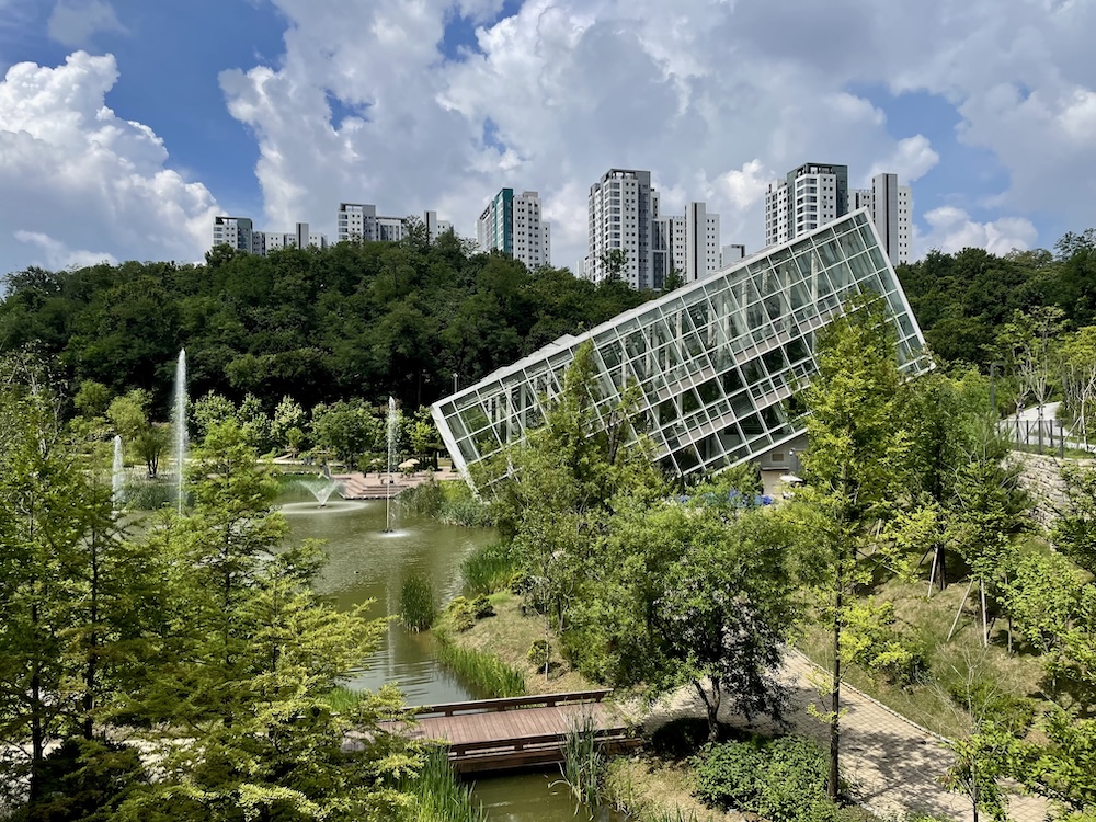 Suwon Arboretum Yeongheung — дендрарий и прилегающий к нему большой парк для спокойных прогулок и изучения природного разнообразия. Сюда будет интересно заглянуть и поклонникам архитектуры, ведь главное здание представляет собой полностью стеклянный «воткнутый в землю» параллелепипед.