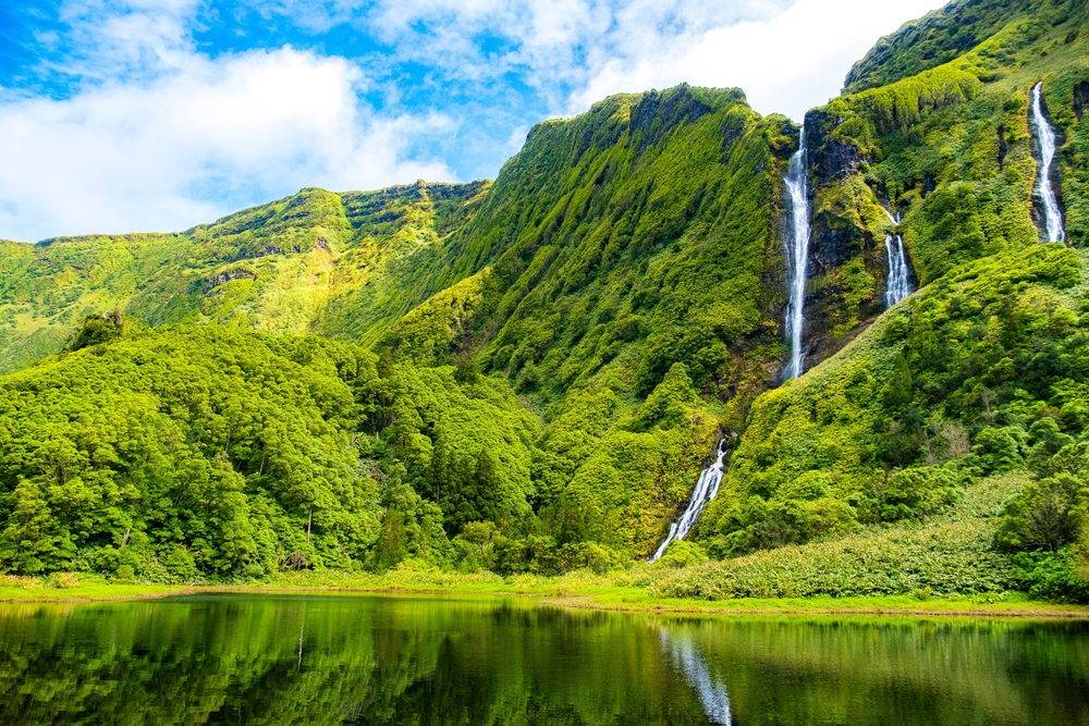 Самый западный из Азорских островов и, пожалуй, самый живописный, получил своё название не случайно: круглый год он утопает в облаках цветущих голубых гортензий. Правда, это самое дождливое место на Азорах, и именно погода часто мешает туристам добраться до острова или в полной мере насладиться его видами. Его береговая линия от Фажа-Гранде до Фажа-Зиньи считается красивейшей во всём архипелаге. Здесь, среди густой зелени, каскадом падают десятки водопадов, и самый впечатляющий из них — Рибейра-Гранде высотой около трёхсот метров.