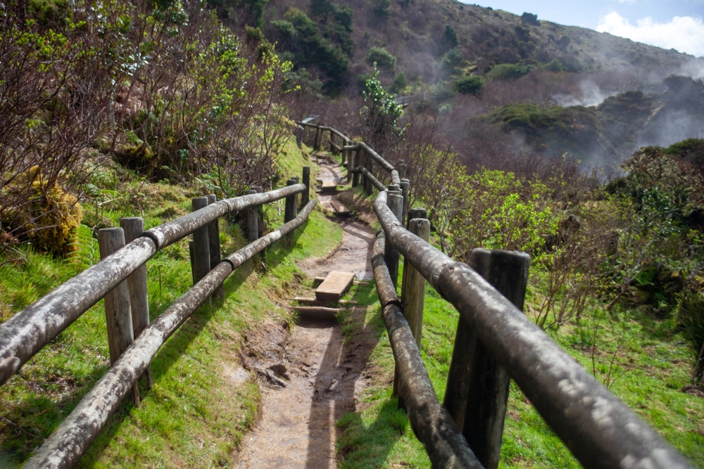 На острове есть и действующие геотермальные зоны. Фурнаш-да-Эншофре — фумаролы, отверстия в земной коре, из которых выходит горячий газ. Воздух насыщен запахом серы, влажность очень высокая, и прямо на камнях растут водоросли. Место впечатляет, хотя надолго задерживаться не стоит — вредно для здоровья.