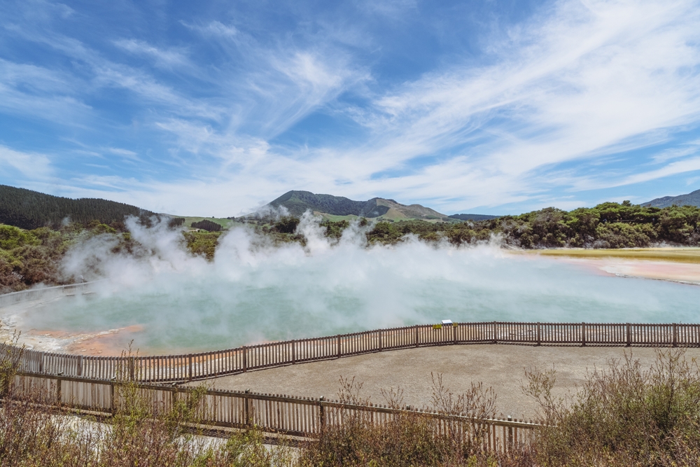 Геотермальная активность и изобилие горячих источников — ещё одна особенность Новой Зеландии. Мы уже писали о курорте Роторуа, куда приезжают отдохнуть в спа-центрах и получше узнать культуру маори; оттуда можно доехать до Ваймангу, одного из самых больших гейзерных парков в стране. Маори называли эти места страной горячей воды, и название полностью себя оправдывает: долина представляет собой масштабную гидротермальную систему с дымящимися кратерами, горячими источниками и гейзерами, выбрасывающими пар и воду. Из-за сероводорода воздух здесь наполнен характерным запахом, а клубы пара поднимаются над землёй даже в прохладную погоду. Туристические тропы проходят мимо озёр с необычными оттенками воды, включая знаменитое Frying Pan Lake, где из-за газов создаётся эффект кипения, хотя температура воды на поверхности может оставаться относительно низкой.