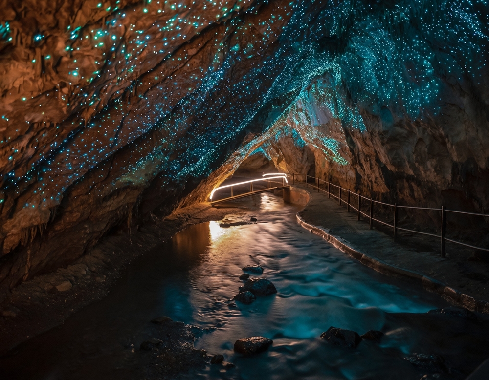 Пещеры с «синими светлячками» встречаются и на Северном, и на Южном острове Новой Зеландии, но самые известные и доступные находятся именно здесь, неподалёку от городка Те-Куити. При этом название вводит в заблуждение: никакие это не светлячки, а личинки местных грибных комаров, которые селятся на сводах пещер, где, подобно паукам, плетут длинные липкие нити. Голубоватое свечение служит приманкой для насекомых и создаёт эффект звёздного неба — зрелище нереальное, и многие путешественники говорят, что неповторимое. Чтобы «огни» не погасли, посетителей просят говорить шёпотом и двигаться как можно осторожнее: червячки громких звуков пугаются.