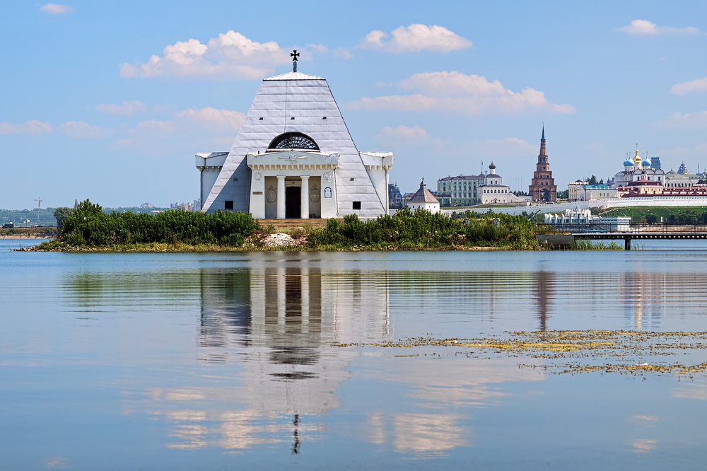 Ещё один не совсем обычный храм расположен на небольшом острове на реке Казанке. Здание по форме напоминает усечённую пирамиду с крестом на вершине. История у этого строения непростая: изначально церковь возвели на месте братской могилы воинов, павших при взятии Казани в 1552 году. Было это, как вы понимаете, не посреди реки — но и прежнее место вышло неудачным, по весне храм часто затапливало. Так что памятник и мощи перенесли чуть дальше. Нынешнее здание построено с 1813 по 1823 год. Долгое время храм был закрыт для посещений, но летом 2025 года завершилась его масштабная реконструкция, и теперь все желающие могут зайти внутрь. Одним из первых посетителей был патриарх Московский и всея Руси Кирилл, который освятил храм и передал в него икону святого праведного воина Феодора Ушакова.