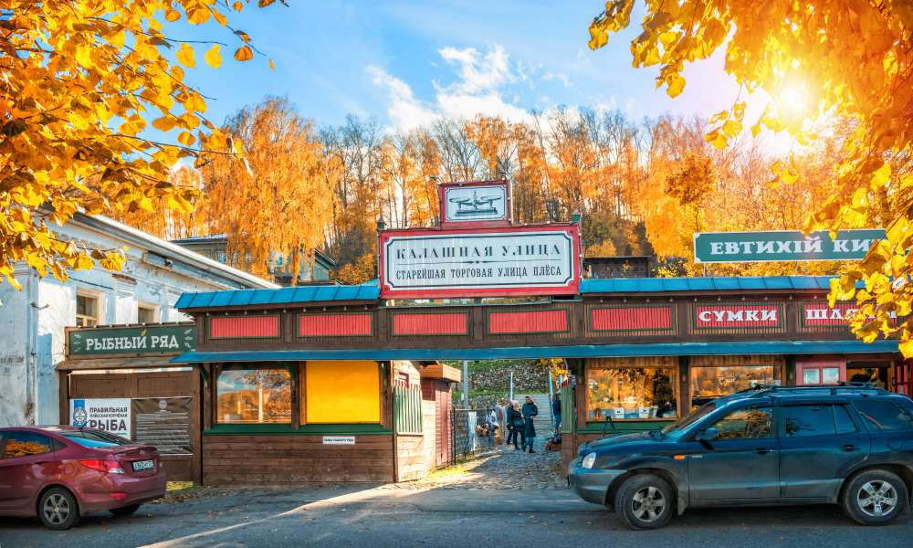 За кофейней проходит старейшая торговая улица Плёса — Калашная, где и сейчас расположен небольшой торговый ряд с местными сувенирами. На выбор множество глиняных свистулек, которые тут называют чувильками, недорогие деревянные мини-домики с цветными наличниками, расписные лошадки, льняные изделия и предметы из бересты с традиционными яркими узорами.