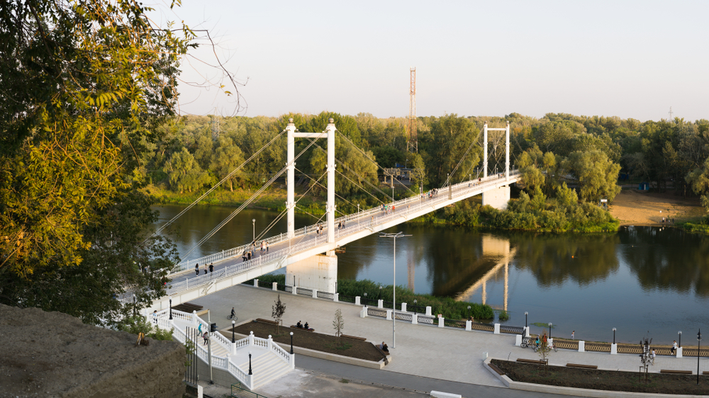 Через реку Урал проходит подвесной пешеходный мост. По легенде он соединяет два континента — Европу и Азию. В подтверждение этому в центре моста установлен пограничный столб. С одной стороны — с надписью «Европа», с другой — «Азия». Изначально мост был деревянным, но из-за ежегодных весенних половодий пришлось заменить его на металлический. Сооружение стало визитной карточкой Оренбурга.