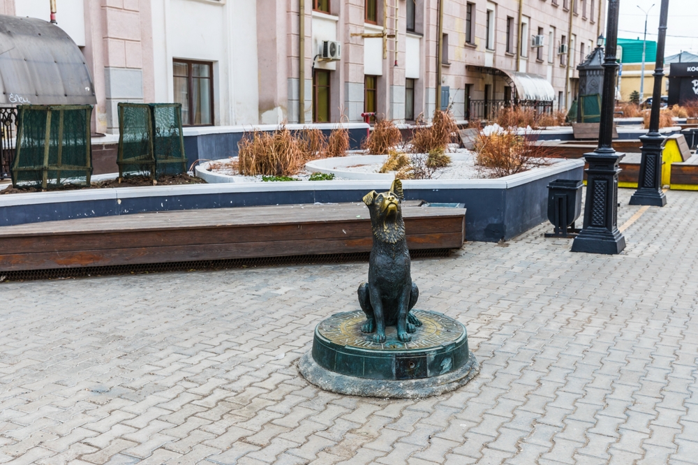 - Бездомная собака. Это и памятник, и копилка: в прорезь в люке можно бросить монетку, а все доходы идут в фонд общественной организации «Подари им жизнь». Пёсик сидит на улице Советской и добродушно смотрит на прохожих.