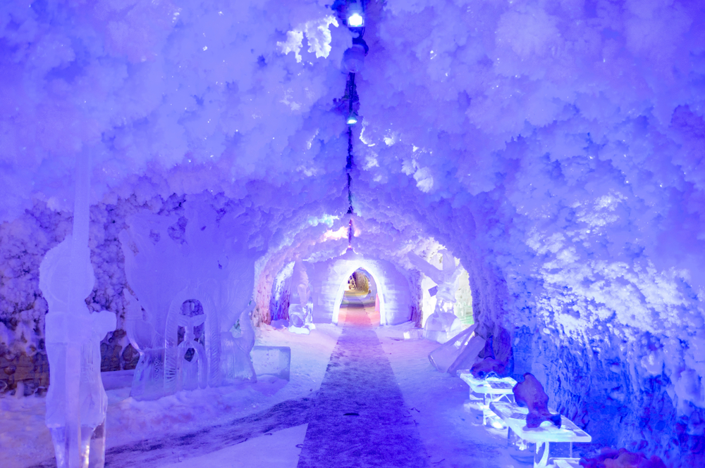 В леднике красивая цветная подсветка и всё сделано изо льда: фигуры, арт-объекты, мебель и даже барная стойка и стопки, в которых подают крепкие настойки и закуску в виде строганины. Здесь можно сделать фото с разными ледяными персонажами, скатиться с горки и сыграть в кёрлинг.