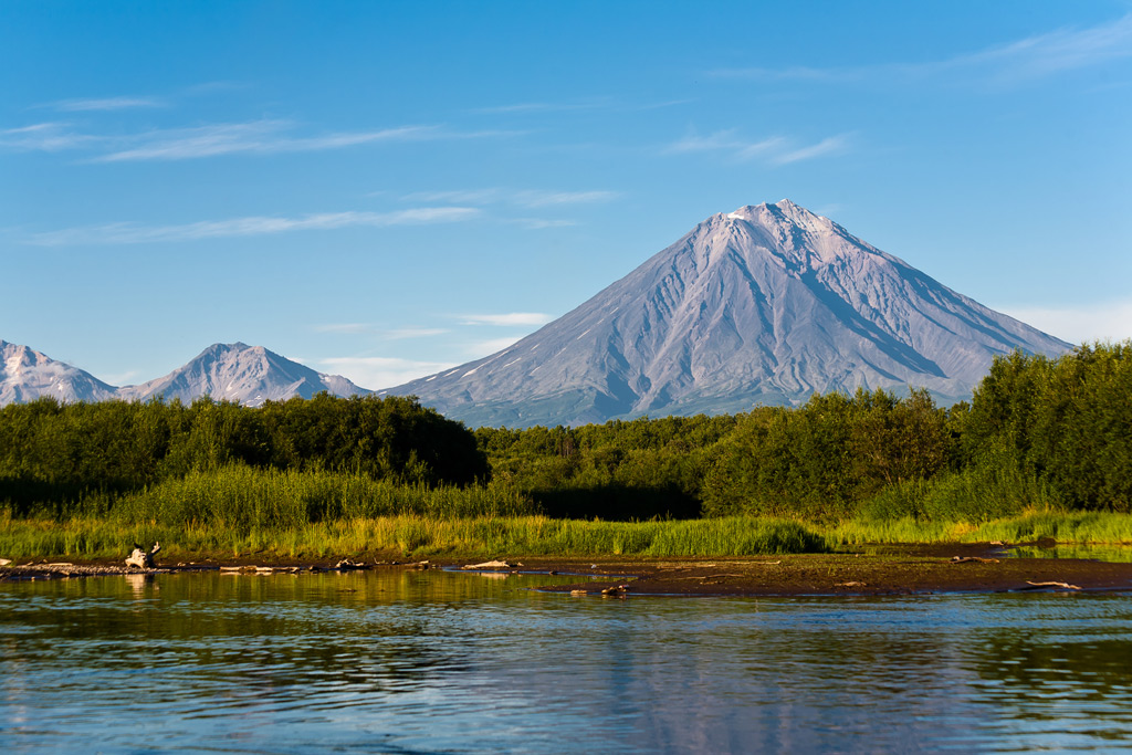 Вулкан Ключевская Сопка — это идеальный усеченный конус с диаметром основания в 15 километров. Над главным кратером всегда вьется лёгкая дымка, а его вершину венчает ледяное «одеяло», которое никогда не тает.