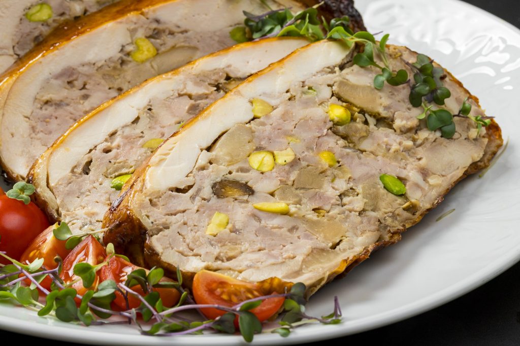 Галантин подавали холодным, нарезанным на тонкие ломтики, с горчичным соусом и маринованными огурчиками. За галантином на авторский манер отправляю вас в ресторан «Графин» (Татарская, 36) — в меню он называется «Цыплёнок сам в себе», и это божественно вкусно.