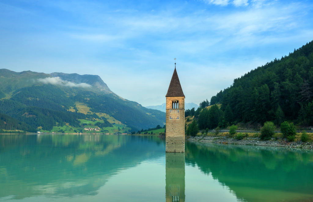 Это таинственное местечко в Альто-Адидже своим появлением также обязано плотине. От затопленных более 60 лет назад деревушек Решен и Граун уже почти ничего не осталось, кроме колокольни XIV века, возвышающейся над водой. Подойти вплотную к её стенам можно зимой, когда озеро замерзает, либо в тёплое время года, на лодке. Ходят слухи, что иногда там можно услышать перезвон церковных колоколов, несмотря на то, что их сняли с колокольни много лет назад.