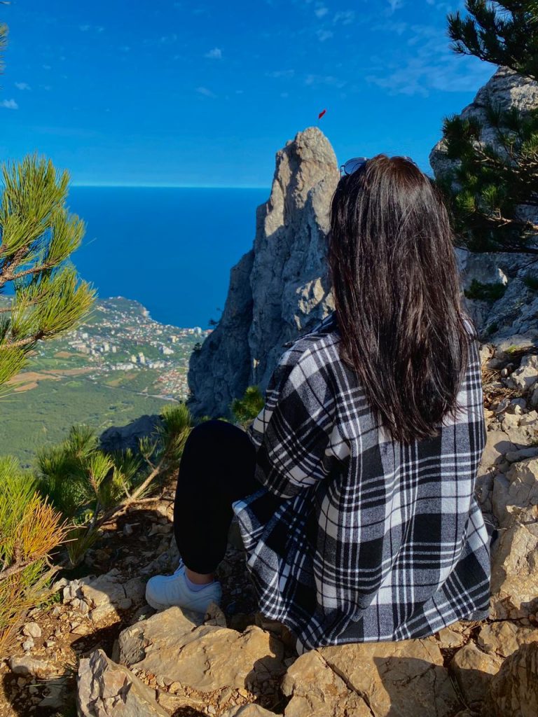 Мы доехали до парковки, от которой совершили последний пеший рывок по горной каменистой местности. Наверху нас ожидал невероятный вид с горы Ай-Петри, который стоил всех затраченных усилий. На такой высоте море практически сливается с небом, а город кажется крошечным — хочется часами сидеть и любоваться этой красотой.
